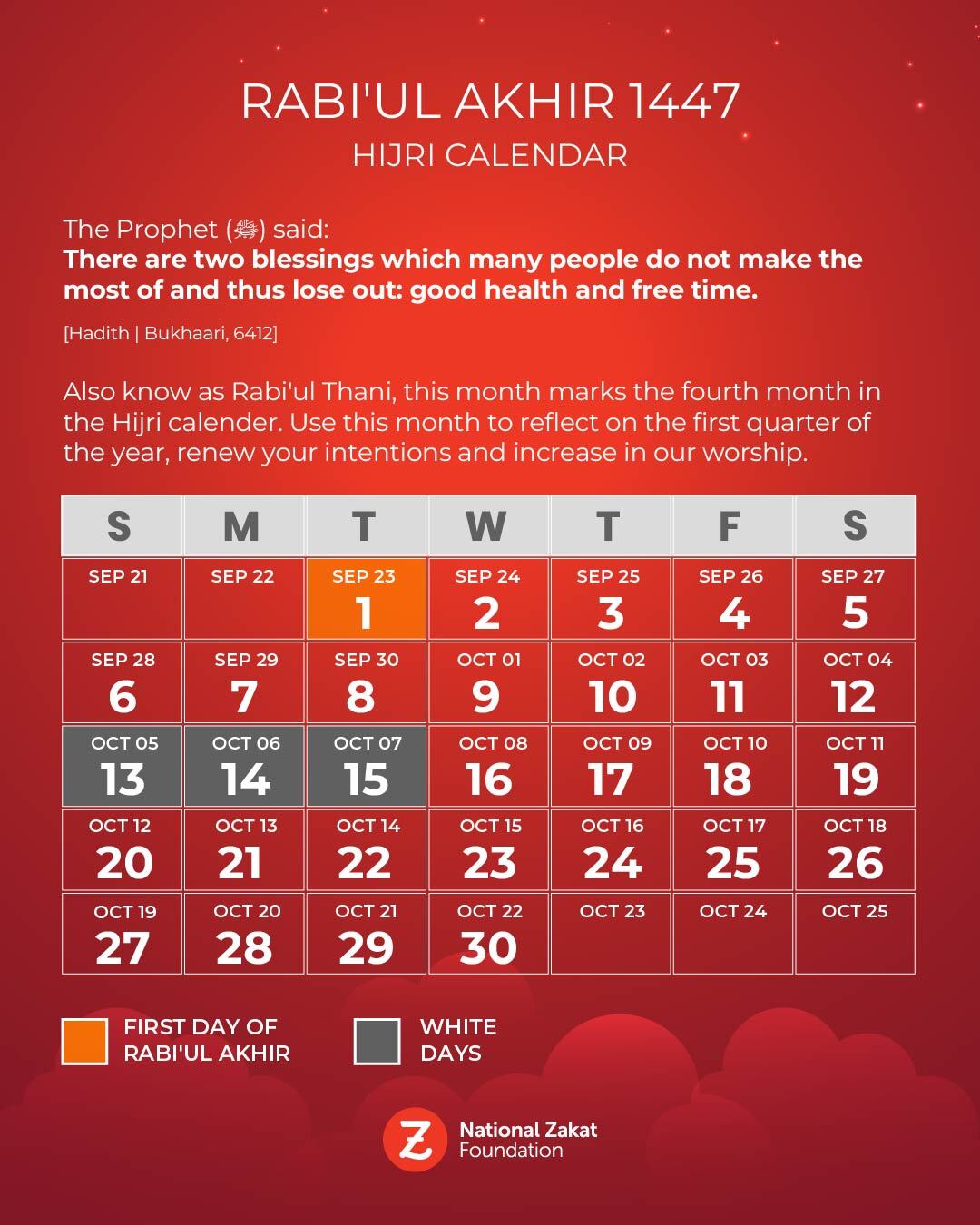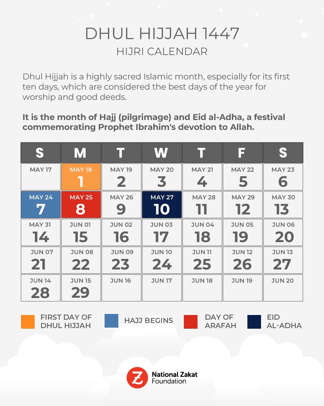 National Zakat Foundation Canada brings you a detailed, regularly updated Hijri Calendar 2025–2026, beginning with Dhul Hijjah 1446 AH and running through Dhul Hijjah 1447 AH.